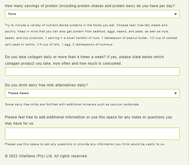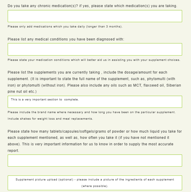 This supplement assessment tool takes approximately 15-20 minutes to complete and includes questions based on lifestyle factors, dietary intake, chronic conditions, supplements and medication taken. All of this information is carefully considered and influences the results of your report.