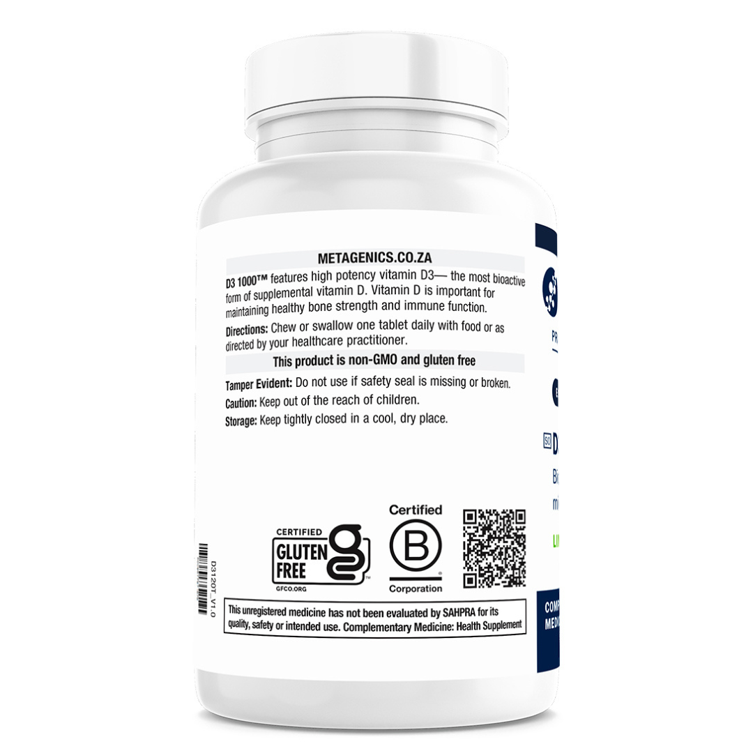 D3 1000™ by Metagenics features high potency vitamin D3, the most bioactive form of supplemental vitamin D. Vitamin D is important for maintaining healthy bone strength and immune function.