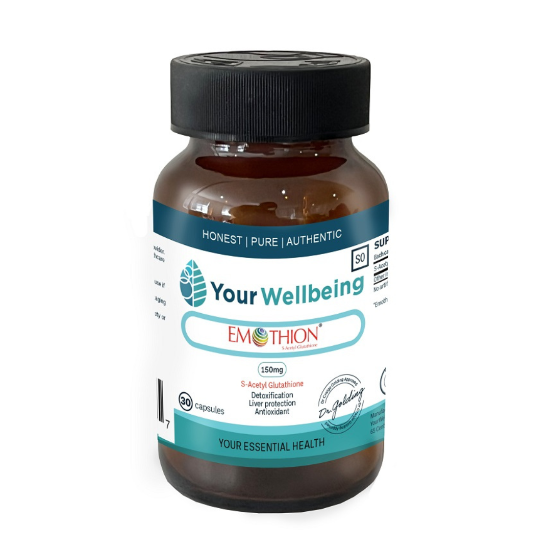 A clinically studied and patented orally stable, crystalline form of s-acetyl-glutathione, with enhanced bioavailability and fast action. It is the effective -in body- form of glutathione. EMOTHION® by Your Wellbeing is easily absorbed and transported to tissues. It raises the GSH level inside the cells more efficiently than normal GSH. This means it provides enhanced bioavailability and greater intracellular antioxidant support, helping healthy aging and lifestyle.