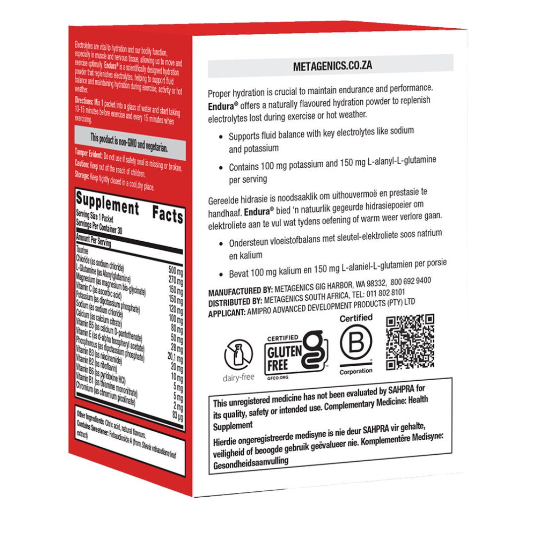 Hydrate with Endura®, electrolytes are vital to hydration and bodily function, especially in muscle and nervous tissue, enabling optimal movement and exercise. Endura is a scientifically designed hydration powder that replenishes electrolytes, supporting fluid balance and maintaining hydration during exercise, activity, or hot weather.