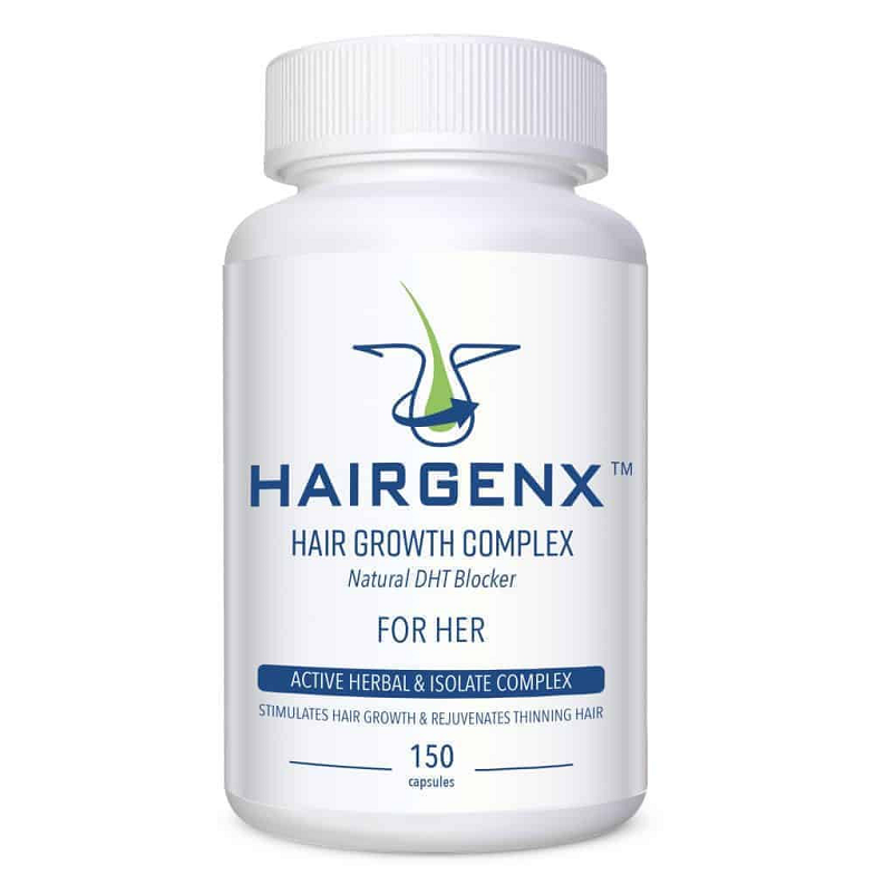 Hairgenx™ Hair Growth Complex For Her is formulated from a proprietary blend of natural herbal extracts that have been scientifically proven to combat thinning hair and hair loss by inhibiting the production of the 5-A reductase enzyme in the body, which prevents the formation of the more potent and destructive androgen dihydrotestosterone (DHT). For those who are so predisposed, this androgen attaches to follicle receptors cutting of blood flow preventing the absorption of vital nutrients. This results in the hair becoming thinner and thinner until it is lost.