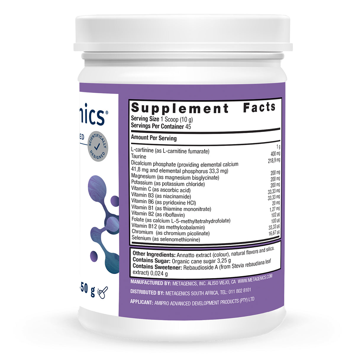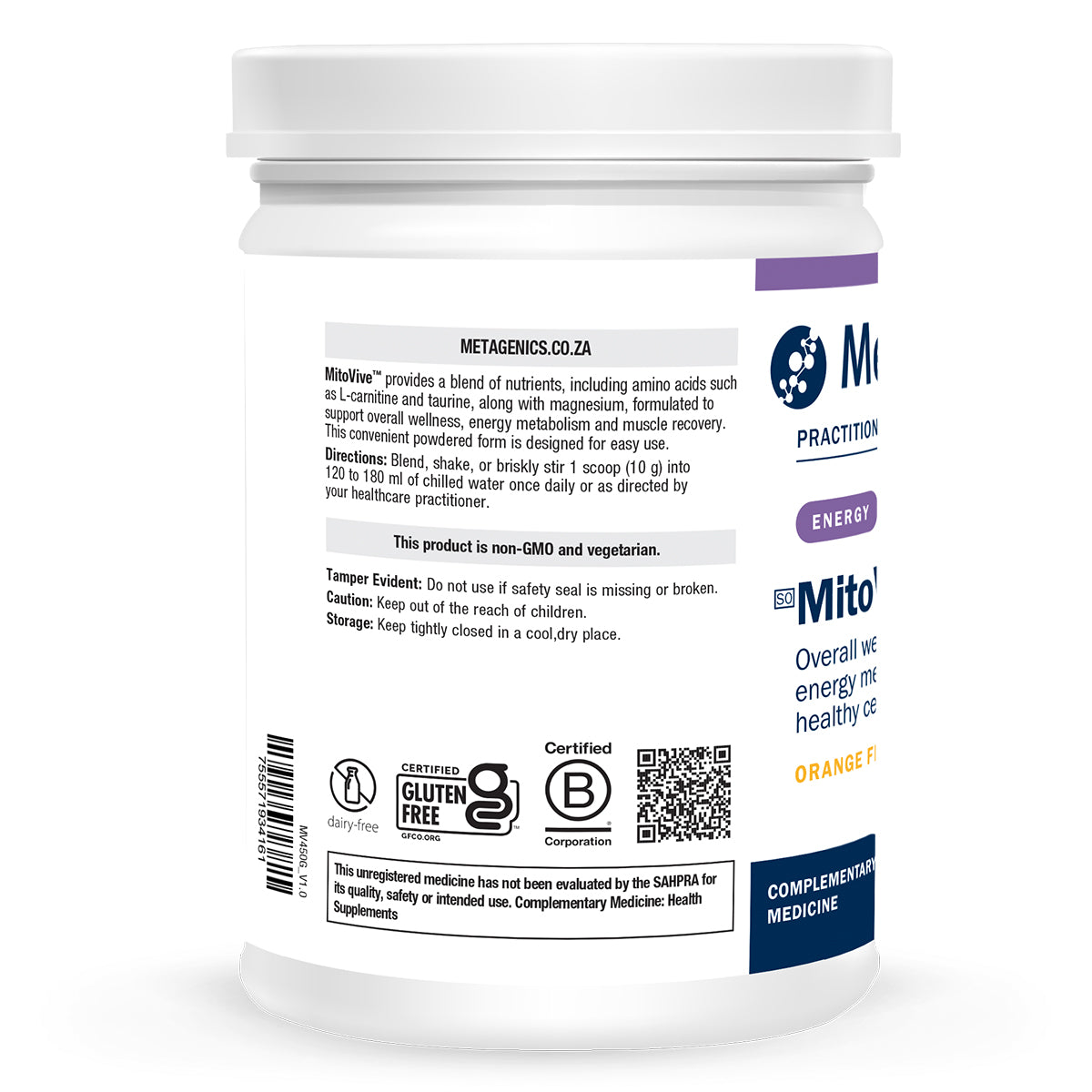 MitoVive™ by Metagenics provides a blend of nutrients, including amino acids such as L-carnitine and taurine, along with magnesium, formulated to support overall wellness, energy metabolism and muscle recovery. This convenient powdered form is designed for easy use.