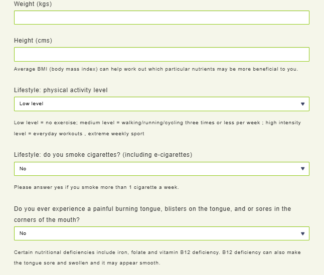This supplement assessment tool takes approximately 10 minutes to complete and includes questions based on lifestyle factors, dietary intake, chronic conditions, supplements and medication taken. All of this information is carefully considered and influences the results of your report.