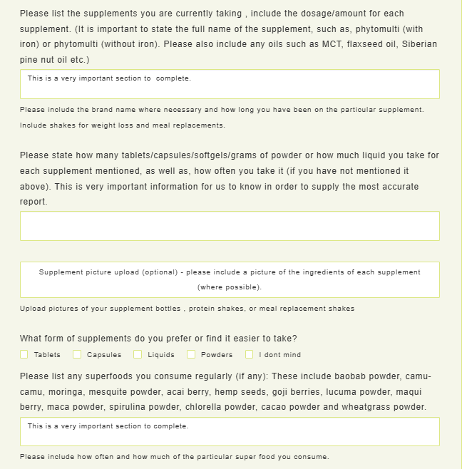 This supplement assessment tool takes approximately 15-20 minutes to complete and includes questions based on lifestyle factors, dietary intake, chronic conditions, supplements and medication taken. All of this information is carefully considered and influences the results of your report.