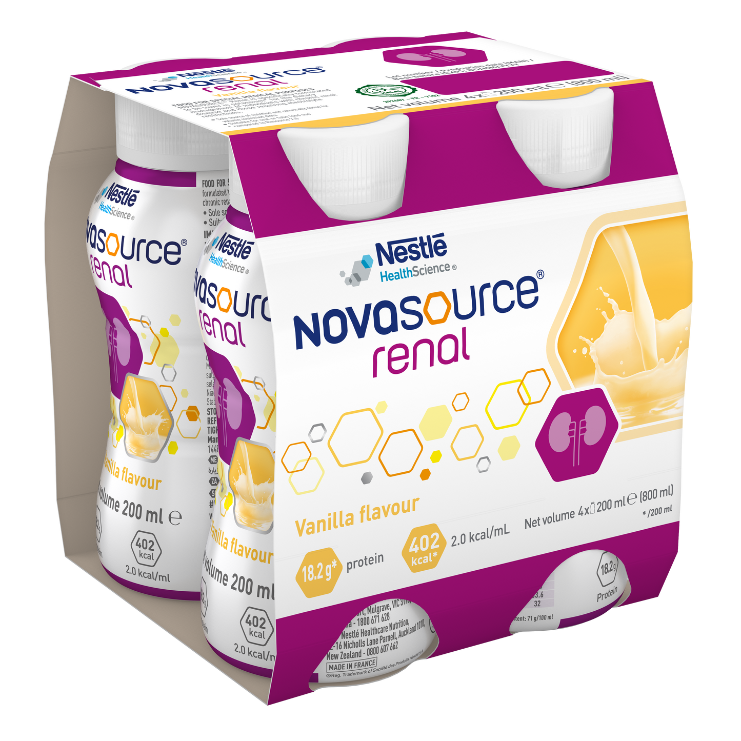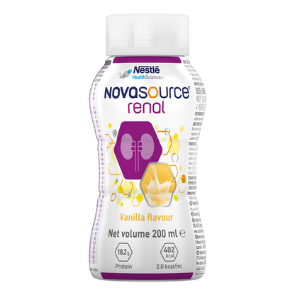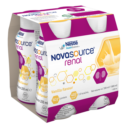 NOVASOURCE® Renal by Nestlé is a calorically dense, high protein and complete nutrition formula to meet the needs of people with chronic kidney disease (CKD) on dialysis or acute kidney injury (AKI). It is low in electrolytes for the dietary management of individuals with CKD and for those requiring electrolyte restrictions. It is suitable for oral or tube feed use.