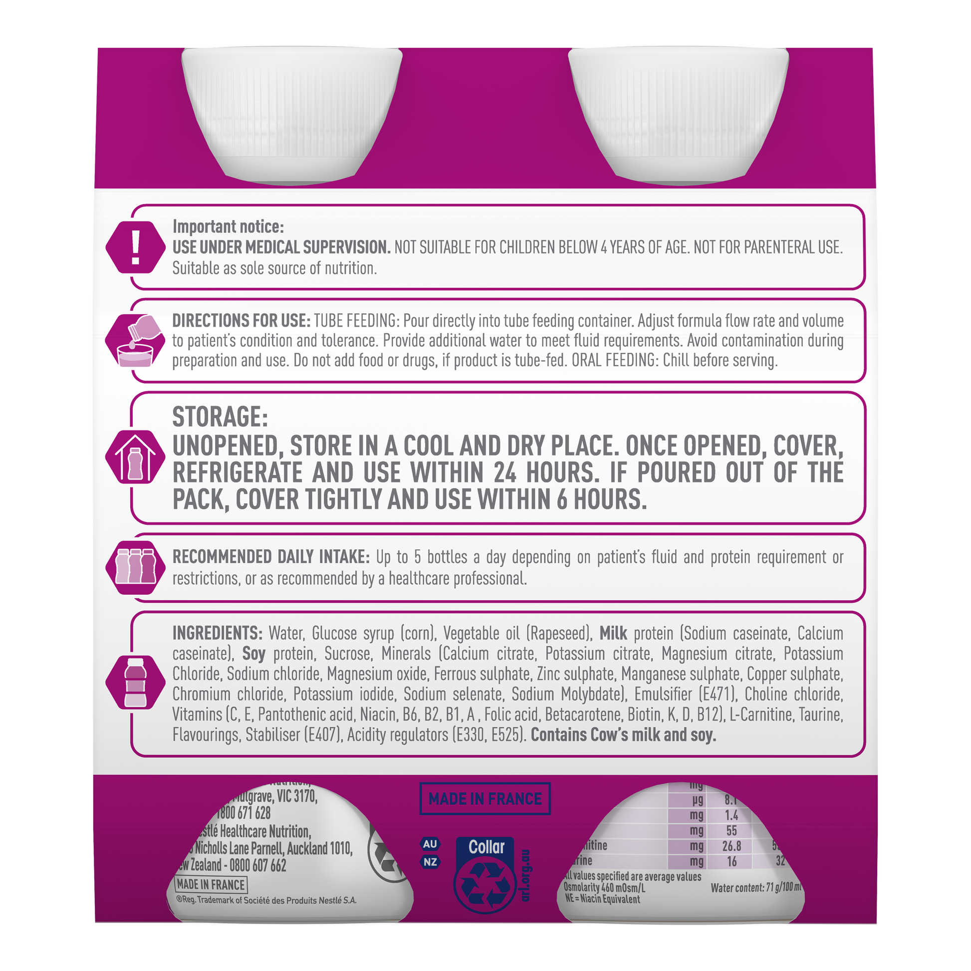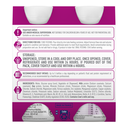 Recommended daily intake: Up to 5 bottles a day depending on patient's fluid and protein requirement or restrictions, or as recommended by a healthcare professional.