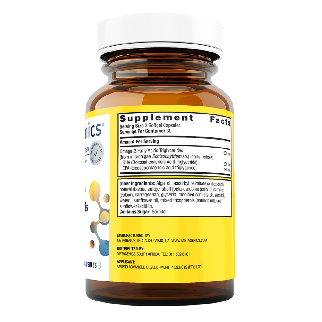 Omegagenics Algae Omega-3's 300 mg by Metagenics helps to support cognitive health and brain function. Features a concentrated, purified vegetarian source of omega 3 fatty acids from the microalgae Schizocytrium sp. Each softgel provides 300 mg of omega 3 in the triglyceride form.