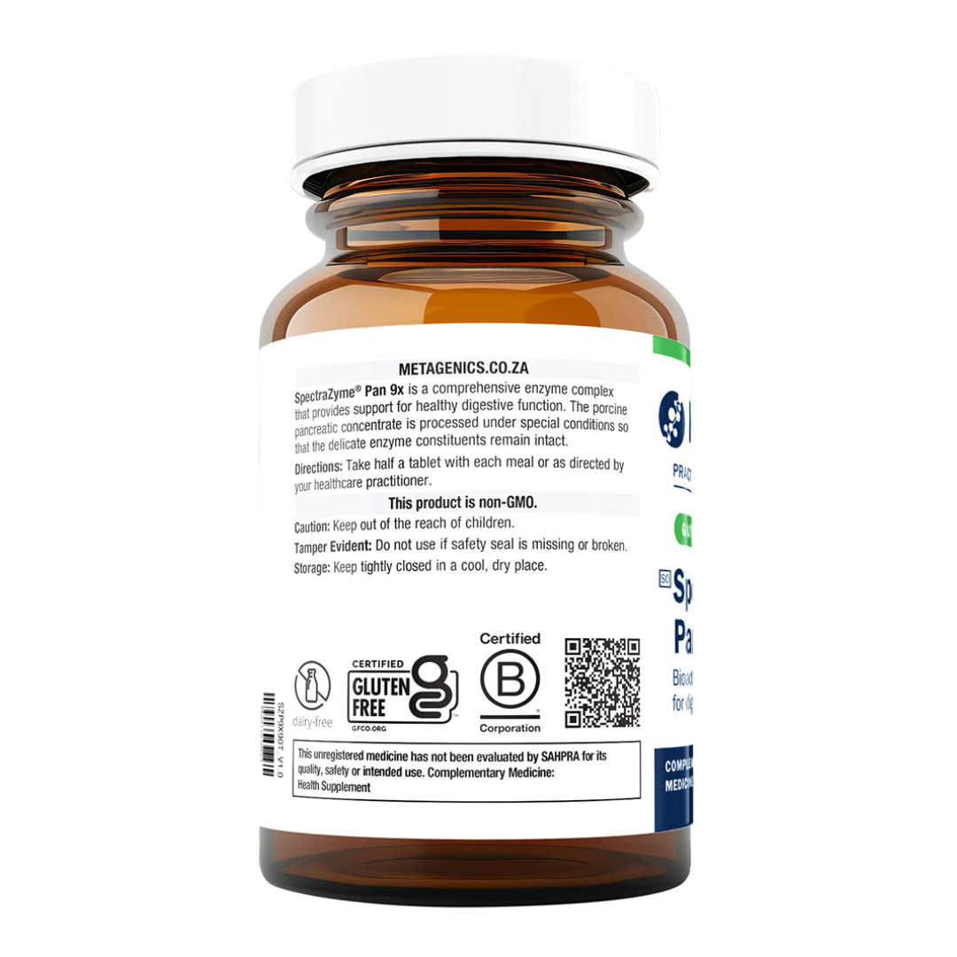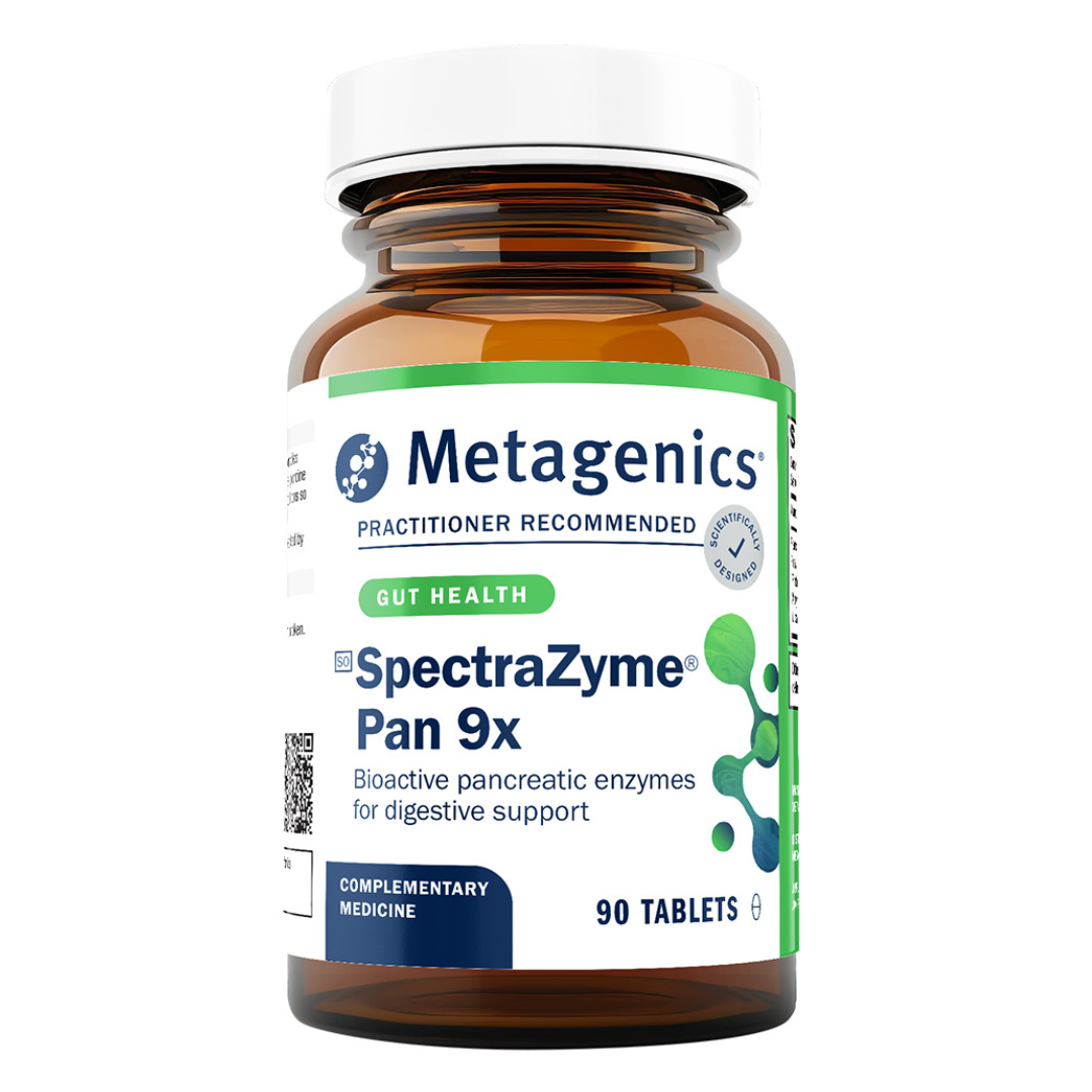 SpectraZyme® Pan 9x by Metagenics is a comprehensive enzyme complex that provides support for healthy digestive function. Processed under special conditions so that the delicate enzyme constituents remain intact.
