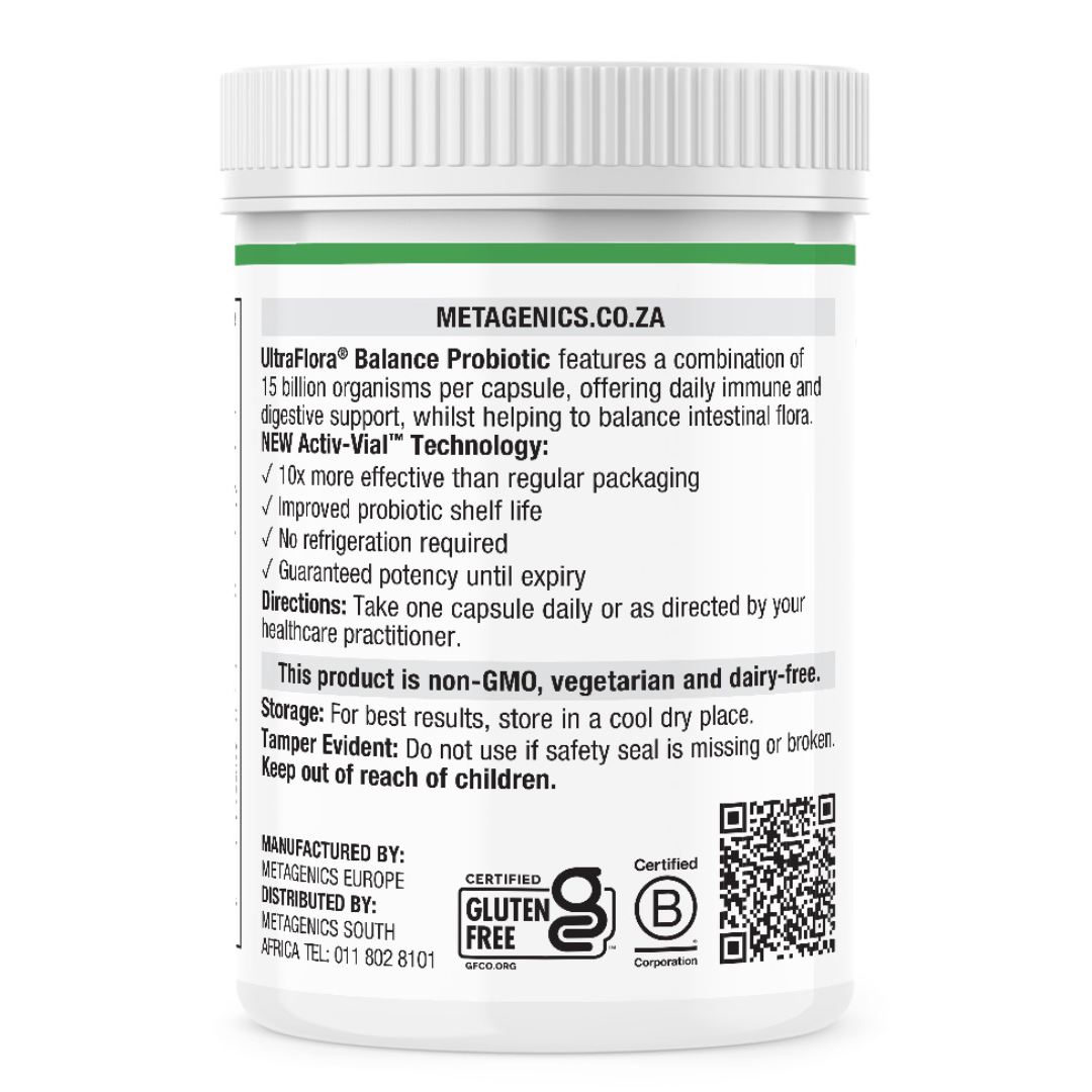 UltraFlora® Balance Probiotic by Metagenics features a combination of 15 billion organisms per capsule, offering daily immune and digestive support, whilst helping to balance intestinal flora.