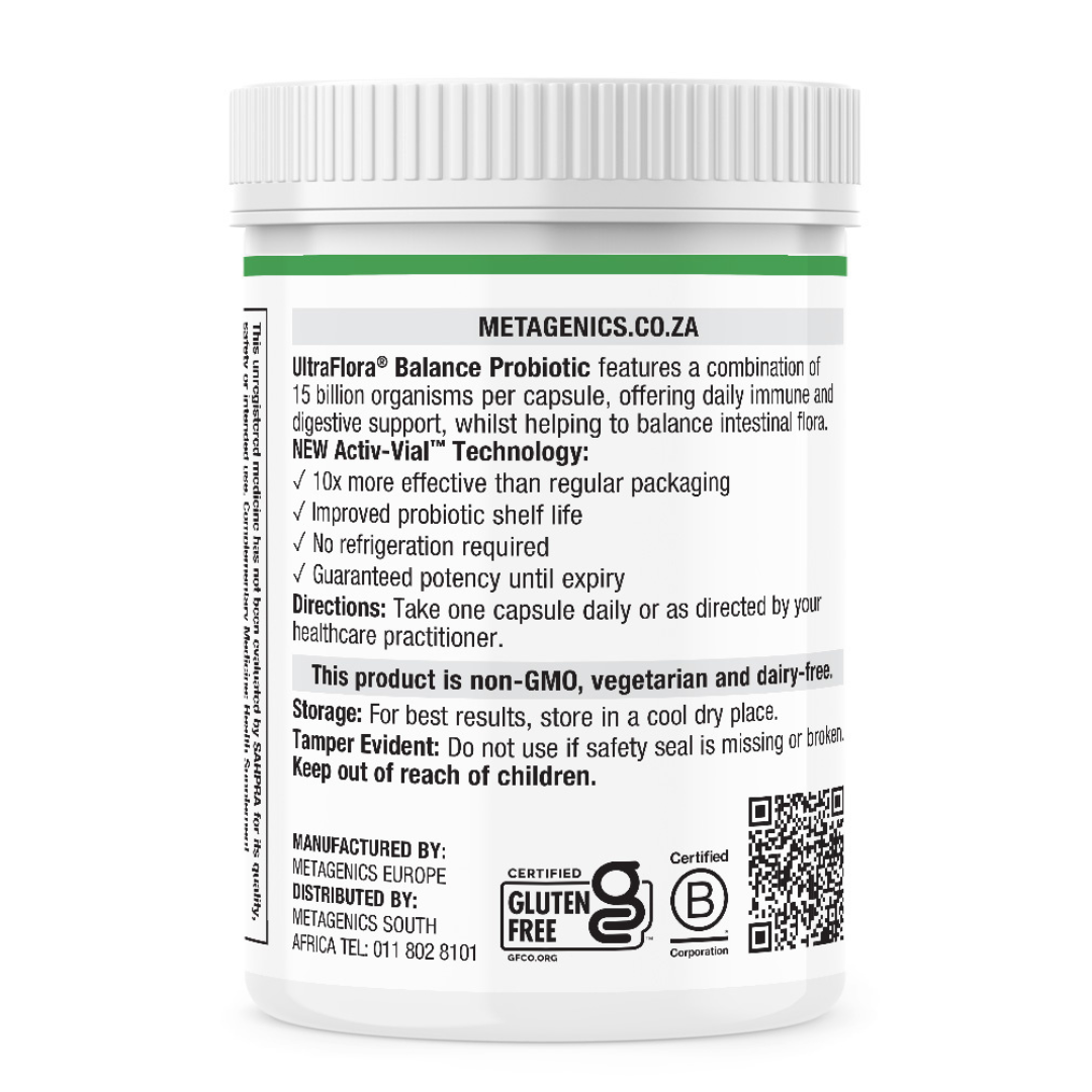 UltraFlora® Balance Probiotic by Metagenics features a combination of 15 billion organisms per capsule, offering daily immune and digestive support, whilst helping to balance intestinal flora.